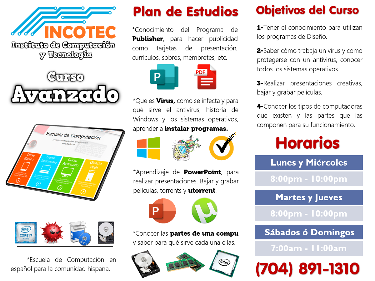 CURSO AVANZADO. Manejo de los  programas de diseño Publisher y PowerPoint. Virus y antivirus, historia de Windows.  Instalar programas, utorrent, abrir un CPU y ver todos los componentes.